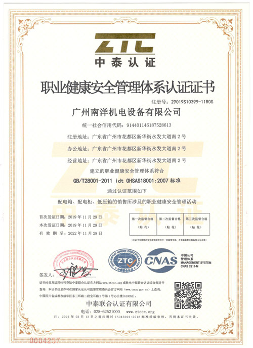 职业健康安全管理体系认证证书